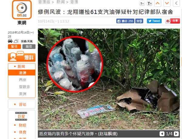 香港暴徒所使用的武力近日愈见升級。综合香港“东网”、《星岛日报》消息,香港警方14日检获61支汽油弹,初步调查后不排除有人计划借此攻击位于附近的黄大仙纪律部队宿舍。