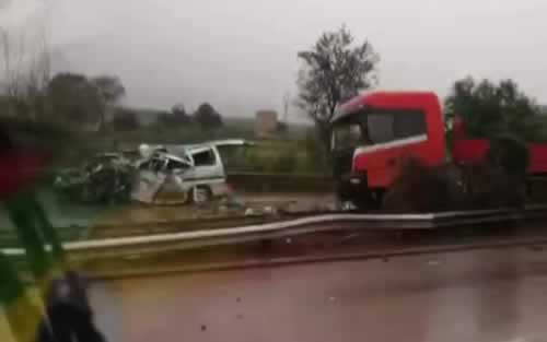 现场视频显示,高速路中间的一段隔离带被完全撞毁,一辆商务车停放在路边,车头变形,一辆红色拖挂车穿过高速路的中央护栏,横跨在护栏上。现场有“中国公路”字样的车辆在执勤,另有交警在疏导交通。