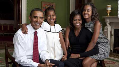 奥巴马全家福:奥巴马16岁大女儿玛莉亚、妻子米歇尔、奥巴马,13岁小女儿萨莎