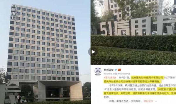 10月21日晚,杭州公安发布通报称,警方初步调查发现,51信用卡公司委托外包催收公司冒充国家机关,采取恐吓、滋扰等软暴力手段催收债务的行为,涉嫌寻衅滋事等犯罪。案件侦办中。