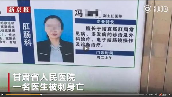 兰州警方通报称,犯罪嫌疑人杨某某(男,54 岁,兰州市人)在甘肃省人民医院肛肠科,持刀对医生冯某某(女,42 岁,兰州市人)行凶。虽经全力抢救,冯某某不幸离世。