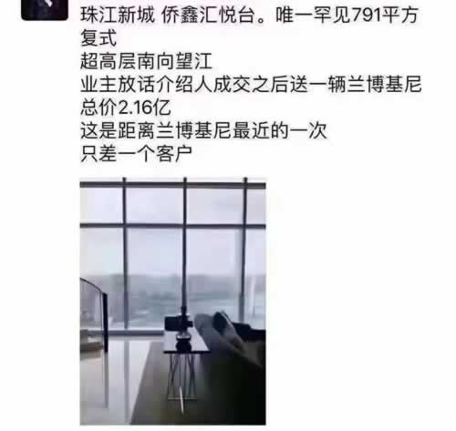 广州二手楼市有说是最高的佣金奖励出炉——日前,位于珠江新城顶级豪宅的一位神秘业主,放出一套标价2.16亿元的房源,业主同时放言,谁介绍客户并成功交易,奖励一辆兰博基尼。