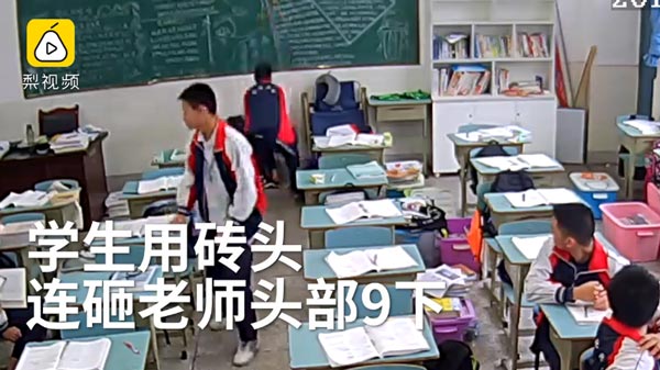 实拍初三男生不服管理持砖猛砸老师头部9下视频