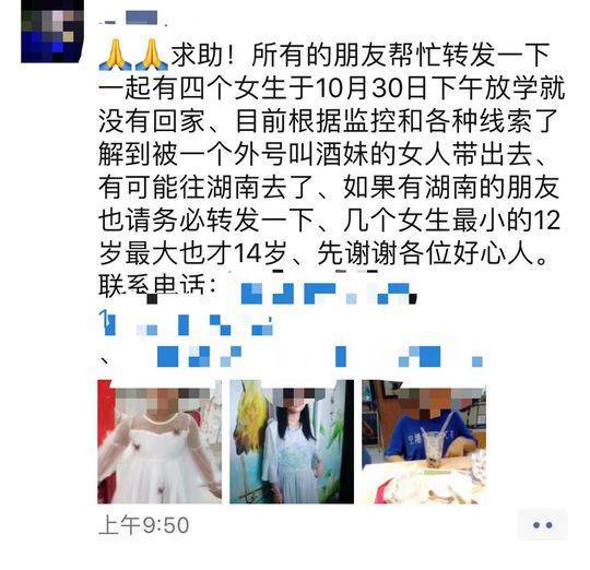 当地派出所调取学校周边路口监控后,几名女孩走入了盲区。在一份家属发来的情况说明中,记者注意到,找人的时候,家属从几名女孩同学口中隐约得知,她们和一个外号“九妹”的社会人士联系过,“九妹”称可以带着几名女孩外出挣钱,女孩便跟着上了出租车,“根据各种线索和监控,很可能已经在外地了,几个女孩还换上了其他衣服。”