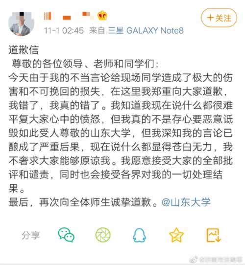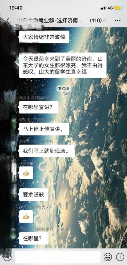 2019年10月31日,我司在山东大学举办的校招宣讲活动中,主持人存在不当言论,对此我们深表歉意,因此带来的后果和对学生造成的伤害我们非常痛心。作为活动主办方,济南高新万达广场已对涉事主持人予以开除处理。