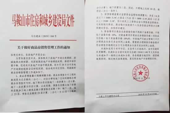 今天,马鞍山住房和城乡建设局一份名为《关于做好商品房销售管理工作的通知》(马住建函【2019】184号)文件在房地产圈内被多次转发,印发时间为11月4日,其中对商品房预售最小规模进行调整,同时调整新预售楼盘资金监管标准,并规定新备案商品房售价不得低于备案价格10%。对此,中国房地产报记者致电马鞍山住建局,其市场监管科相关工作人员表示确认印发了这份文件。