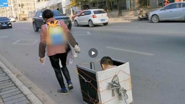 实拍6岁孙子不愿走路上学奶奶自制拉箱拖视频