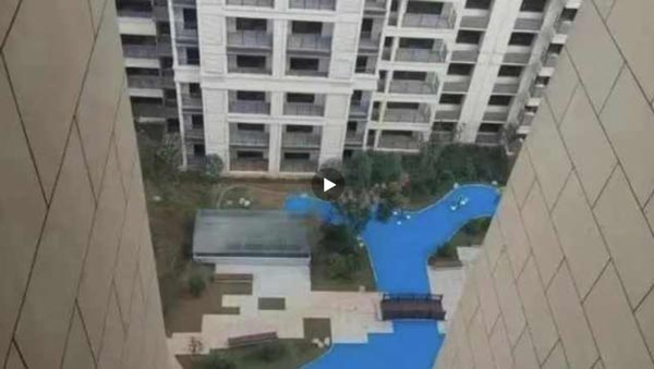 实拍长沙一小区奇葩景观走红塑胶刷蓝伪装湖视频