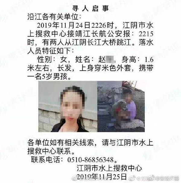 前述网传信息称,24日22时许,江阴长江大桥有两人从江阴长江大桥跳江,其中一名落水者为赵姓女子,身高1.6米,长发,上身穿米色外套。此外,该女子跳江时还携带一名5岁男孩。