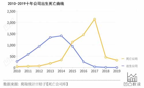 2010 年来,历年出生及死亡的公司数量趋势如下图。2013、2014 年是公司诞生潮,三年后,正好对应了2016、2017的一波死亡潮。在 2017 年,超过 2000 家公司倒闭。