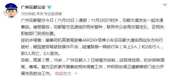 新京报快讯 据广州市公安局花都区分局官方微博消息,11月29日,广州花都警方通报:11月29日7时许,花都大道发生一起交通事故。经查,肇事司机高某疑因疲劳驾驶致操作不当,碰撞路侧一辆自行车(车上3人)和2名行人,致3人死亡、2人受伤。