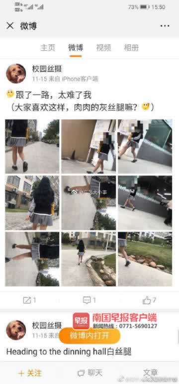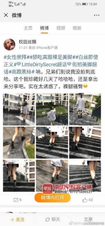 “这个行为实在太恶劣,侵犯同学们的合法权益。”某高校相思湖校区一女学生投诉说,近日,她们同学逛微博时发现,一名为“校园丝摄”的微博网友,在她们校区偷拍不少女生穿丝袜的照片后陆续在微博上发布,引发不少网友围观。