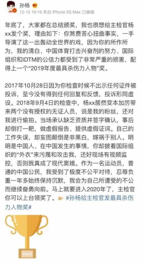 几天前,12月15日的微博上,孙杨置顶的那条写着:“因为你的所作所为,我的清白、中国打击兴奋剂的努力……明明是中国人,在中国发生的事情,你却披着国际组织的‘外衣’……”