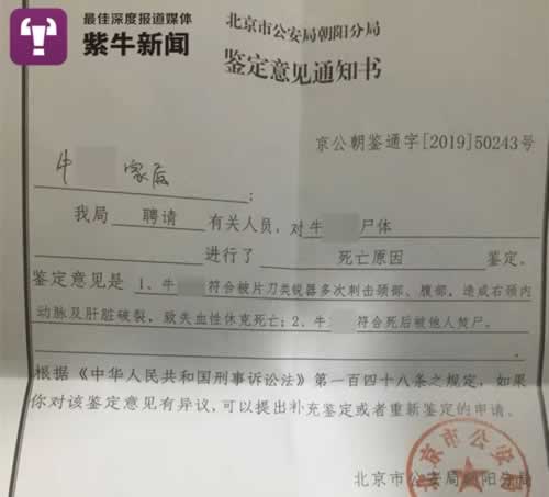 12月26日,刘先生告诉紫牛新闻记者一个最近情况:家属拿到了北京市公安局朝阳分局出具的《鉴定意见通知书》。这份通知书显示,牛某杰符合被片刀类锐器多次刺击颈部、腹部,造成右颈内动脉及肝脏破裂,致失血性休克死亡;符合死后被他人焚尸。通知书落款处盖有北京市公安局朝阳分局的公章。