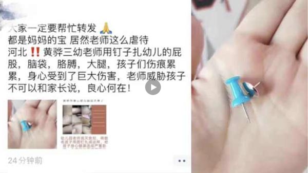 实拍河北黄骅第三幼儿园孩子被针扎涉事老师调岗视频