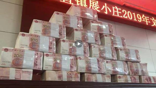 实拍济南一村庄年终大分红176万钞票堆成墙视频