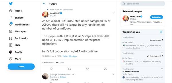 当地时间1月5日晚,伊朗外交部长扎里夫在社交媒体上发文称,作为第五阶段也是最后一个“补救”步骤,将针对伊核协议第36条,对离心机的数量将不再有任何限制。