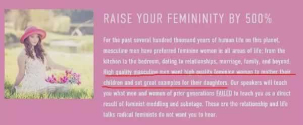 “别再屈服于有毒的女权主义教条,也别再违背作为女人从古至今流传下来的生物本性。开始做你自己吧!”