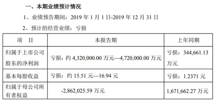 根据业绩预告,一旦协议转让最终完成,拍卖资产包账面值与汇信资产管理收购价即可确认,经财务初步测算预计损失约417.35亿元,对公司2019年年度业绩造成大额亏损。