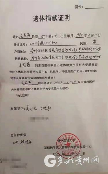 “姐姐走得很安祥,按照姐姐的生前遗愿,我们已将她遗体捐献给贵州医科大学基础医学院人体解剖学教学实验中心,供教学、科研及医疗之用。”1月14日15时在遗体捐献仪式上吴江龙流着泪说,姐姐生前多次说过,虽然家庭不幸,但有各级党委政府和社会各界的帮助,她很温暖。