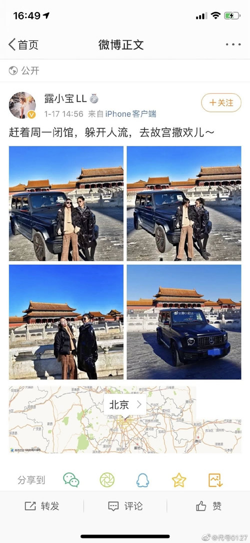 1月17日14时56分,一位名为“露小宝LL”的用户通过微博发布一组照片,配文字是“赶着周一闭馆,躲开人流,去故宫撒欢儿~”。四张配图背景均为太和门广场,三张图片上有一辆黑色奔驰车出现。出镜的两位女士均着便服,没有佩戴任何故宫工作人员证件。