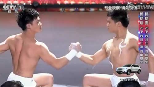其中来自四川26岁的双胞胎兄弟杨皓云杨皓翔带来惊险刺激的高空皮吊。只见身画祥云油彩的双胞胎兄弟杨皓云杨皓翔在上演高空皮吊杂技中,一个个的高难度动作在双胞胎的独有默契中配合得当,整个表演行云流水天衣无缝。力量与技巧的结合展现出惊险刺激的美感,赢得全场观众此起彼伏的尖叫与掌声。下面一起来欣赏翔云兄弟杨皓云杨皓翔高空皮吊精彩视频!