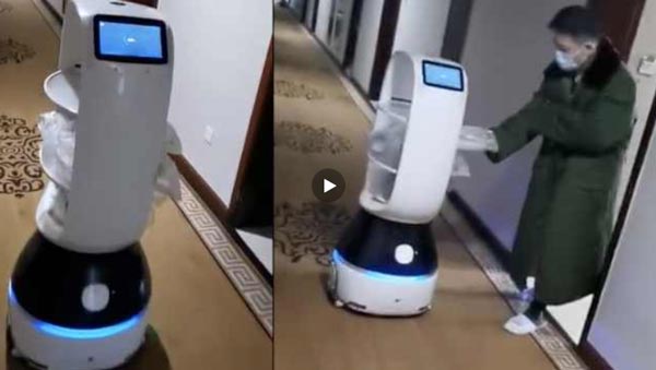 实拍杭州一隔离点收200人用机器人送餐视频
