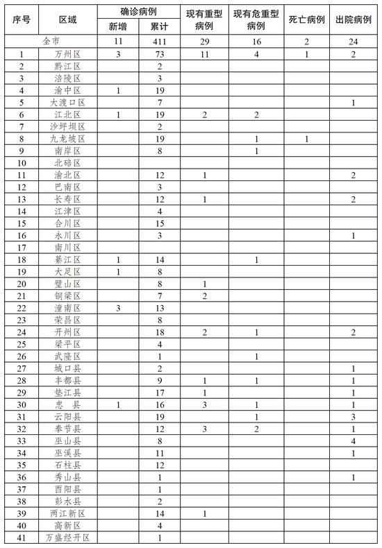新增确诊病例中,万州区3例、渝中区1例、江北区1例、綦江区1例、大足区1例、潼南区3例、忠县1例;新增重型病例中,忠县1例、奉节县1例;重型病例转危重型病例中,万州区2例、綦江区1例、云阳县1例、奉节县1例;新增出院病例中,大渡口区1例、渝北区2例、长寿区2例、开州区2例、城口县1例、云阳县1例。