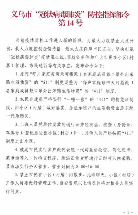 【义乌防控再升级#义乌每家每4天可派一人外出采购#】据@义乌发布8日消息,义乌市原定“每户家庭每两天可指派1名家庭成员戴口罩外出采购生活物资”的“211”制度调整为“每户家庭每四天可指派1名家庭成员戴口罩外出采购生活物资”的“411”制度。
