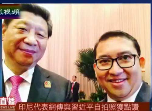 原来是中国国家主席习近平出现在这两张自拍照里,似乎因为第一张拍的有点模糊,拿相机的人又拍了一张,两个人这次都比较清楚,自拍照一贴上网就引发的网民的热议,有中国网民评论说习大大是萌萌哒,也有人点赞说习近平很新潮平易近人,据说照片右侧的这位先生是大印尼行动党的副主席。