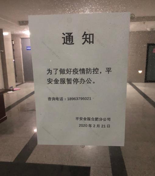 记者来到合肥滨湖办公服务区附近的平安金服办公楼。楼门口已拉起警戒线。上锁的玻璃门上贴着的一张提示写着:为了做好疫情防控,平安金服暂停办公。落款为平安金服合肥分公司。旁边还张贴着一张落款为合肥市公安局包河分局的《新冠肺炎防控集中隔离点警方提示》。