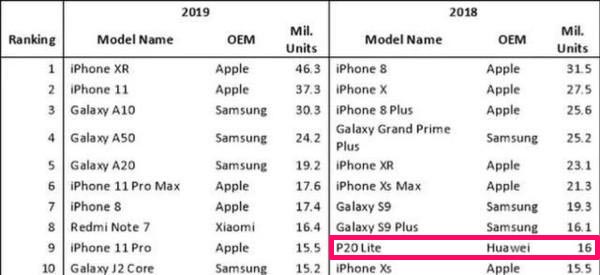 2019年全球手机销量十大榜单公布 华为走向不妙