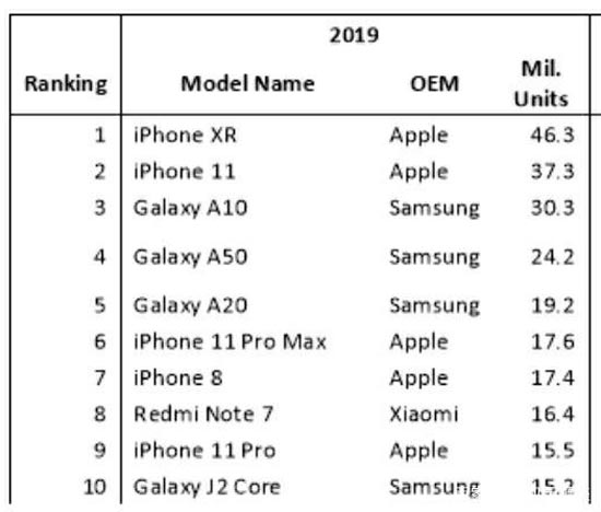 国际知名统计机构Canalys最近公布了一份2019年全球单款手机销量排名前十名单,iPhomeXR排名第一,销量4630万台,iPhone11第二,销量3730万台,三星A10排名第三,销量3030万台。三星A50销量2420万台,三星A20销量1920万台,iPhone 11 Pro Max销量1760万台,iPhone8销量1740万台,排名第八的是Redmi Note7,1640万台销量,iPhone 11Pro销量1550万台,三星 J2 Core销量1520万台。
