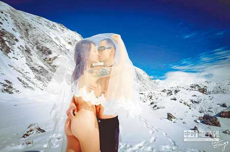 台湾知名部落客“柳丧彪”近日与老公一同到尼泊尔海拔5500m的Gokyo举办高山婚礼,不料却遇上规模7.8的强震;图为两人在高山雪地拍摄裸体婚纱照。(摘自丧彪·柳飘飘)