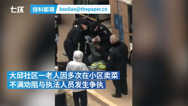 武汉老人小区卖菜不戴口罩被强制带离视频截图