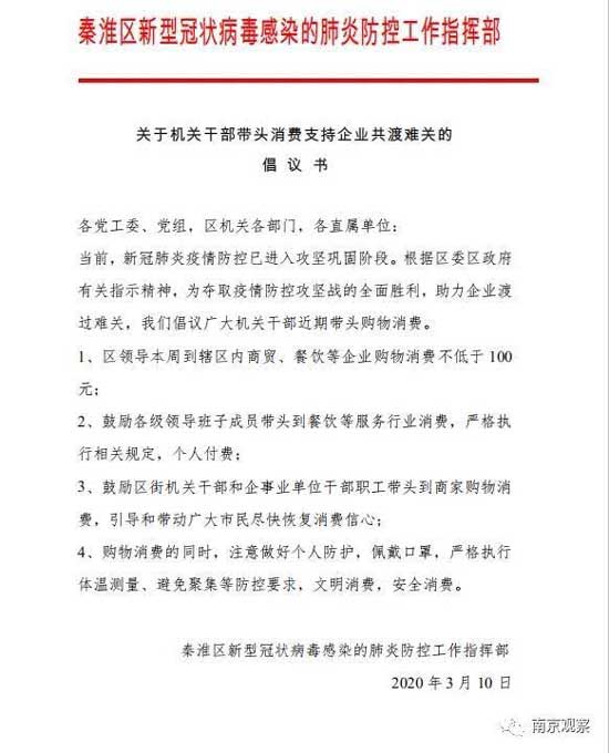 原标题:南京秦淮区倡议干部带头购物消费:区领导消费不低百元