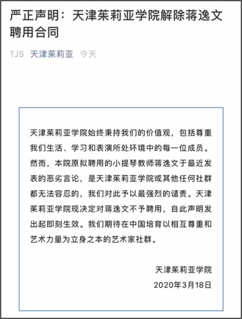 天津茱莉亚学院也宣布解除蒋逸文的聘用合同