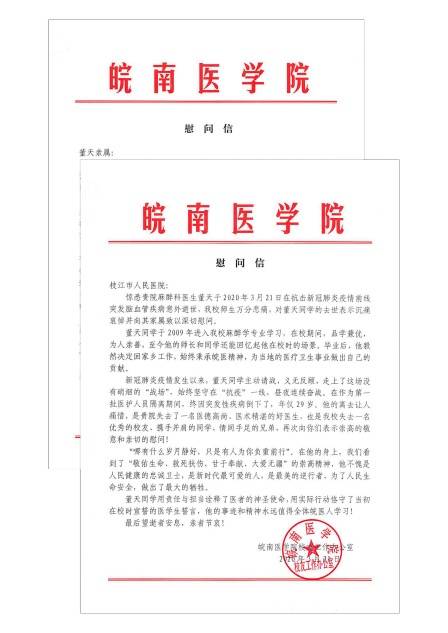学校的悼文写道,董天是“90后”皖医人的杰出代表,“疫情面前他不畏艰险、冲锋在前、舍生忘死,用生命诠释了仁心仁德和大爱无疆,把青春和热血奉献给了矢志不渝的医学事业。轻轻地他走了,却永远活在我们心中!”