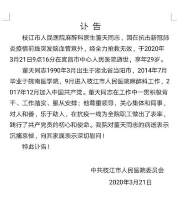 昨日(3月22日),皖南医学院官网对外发布《讣告》称,该校 2014届校友、枝江市人民医院麻醉科医生董天,因在抗击新冠肺炎疫情前线突发脑血管意外,经抢救无效,于21日9时16分在宜昌市中心人民医院不幸逝世,“生命永远定格在了29岁。”