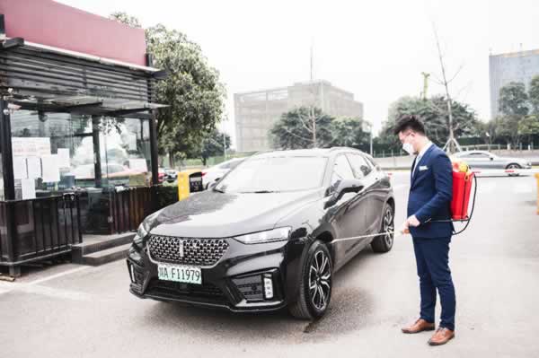 车企和经销商复工后,长城汽车的经销商员工在为汽车消毒