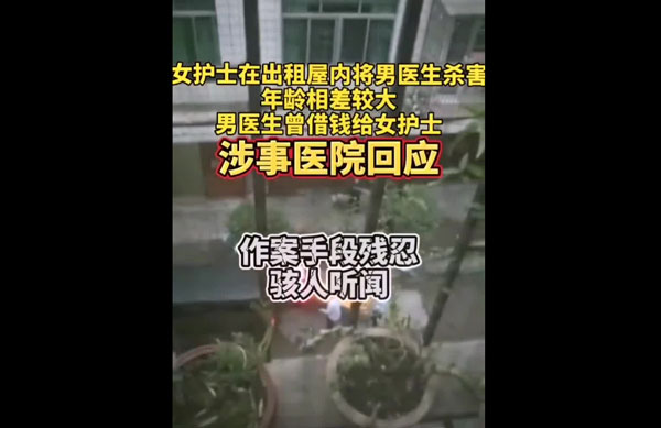 网传信息中,女护士欠外债,其间,男医生曾借钱给女护士,但不知何故,最后女护士在出租屋内将对方杀害。对于此事,涉事医院相关负责人称,具体问相关部门,院方不方便回应。