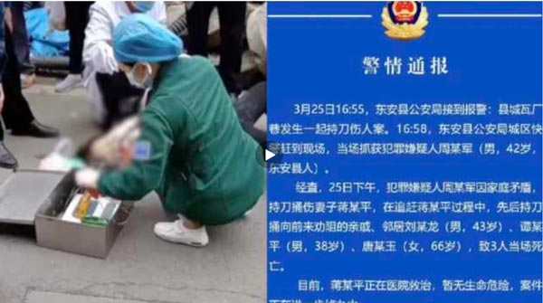 2020年3月25日,湖南东安。42岁的男子周某军因家庭矛盾,持刀捅伤妻子蒋某平,后又捅向来劝阻的亲戚邻居,致3人当场死亡。3人两男一女,分别为38岁、43岁和66岁。周某军被当场抓获,其妻送医救治,暂无生命危险。