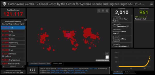 【海外网3月29日|战疫全时区】美国约翰斯·霍普金斯大学的实时数据显示,截至北京时间3月29日6时20分左右,美国累计确诊新冠肺炎病例121117例,累计死亡病例2010例,治愈961人。