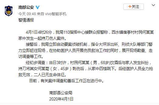 经初步调查:当日3时许,村民何某某(男,68岁)饮酒后与家人发生纠纷,持刀将其女何某菊(女,45岁)刺伤后,从家中四楼跳下。后经医护人员全力抢救无效,二人已无生命体征。