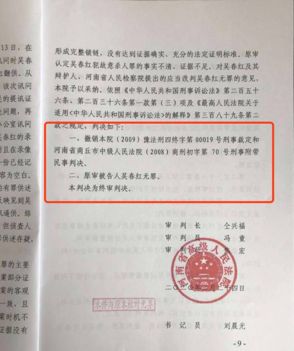 吴春红提出上诉后,河南高院裁定驳回上诉,维持原判。此后,吴春红的申诉亦被河南高院驳回。服刑期间,吴春红坚决不认罪,并拒绝减刑。2016年6月3日,他向最高法院提起申诉。2018年10月3日,吴春红的女儿吴莉莉收到最高法院的《再审决定书》:“吴春红犯故意杀人罪的证据不确实、不充分。指令河南高院对此案进行再审。”