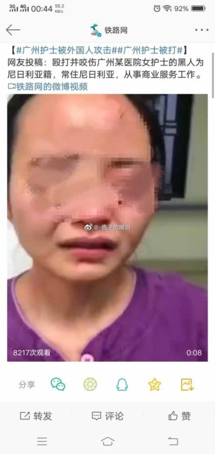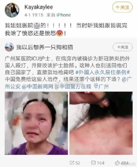 据@广州公安 :广州市公安局新闻办公室今天(4月2日)凌晨0时40分通报:4月1日7时28分许,广州市公安局110台接到报警,称市第八人民医院嘉禾院区住院部一楼隔离病区(以下简称“市八医院”),有一名外籍新冠肺炎确诊患者不配合治疗,并将一女护士打伤。广州白云警方立即派员到场处置。