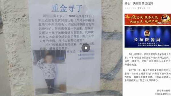 3月15日,河南长垣,一名7岁男童在黄河边放风筝失踪,随后家人报警,当地救援队也加入搜寻。4月10日,长垣警方发布消息,市民在距男童失踪地点35公里处发现一具遗体,经DNA鉴定确认系失踪男童,警方对此深表痛心。