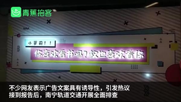 【南宁地铁现涉未成年人不良广告 官方回应:系商业街管理 目前已撤除】#青蕉拍客# 4月8日,有网友称南宁地铁站出口出现涉及未成年人的不良广告。网友们表示,该广告引起了他们的不适。4月9日,南宁地铁通报称,该广告发布位置不在地铁广告经营范围内,属于临近商业街管理。目前负责单位已将该广告撤除。据@南国早报 ,该灯箱广告管理方为百佳汇商场。商场一负责人称该广告已被拆下,其他内容不便回应。目前,南宁市场监督管理局正了解中。