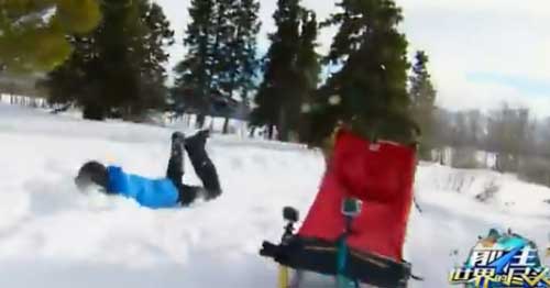 刚踏上雪橇,由于行驶速度缓慢,张杰还能一边保持帅气站姿、一边游刃有余地驾驶。但当时速加快到60公里时,身为新手的张杰就有些hold不住了。只见他站在雪橇上摇摇晃晃如玉山之将崩;在过弯时张杰终于坚持不住,因身体失衡而摔倒在地。正当工作人员准备上前施救时,没想到张杰拍着身上的雪站了起来:“没事,我有八块腹肌。”原来赛道旁厚实的积雪令张杰得以“软着陆”,害得众人虚惊了一场。
