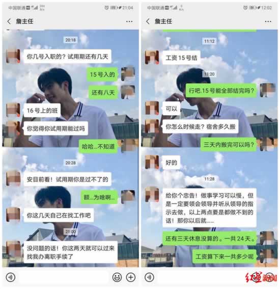 小莉告诉记者,4月7日晚8点过,她答复对方没在宿舍之后10分钟,詹主任的信息就发来了,告诉她试用期过不了,让她办离职。